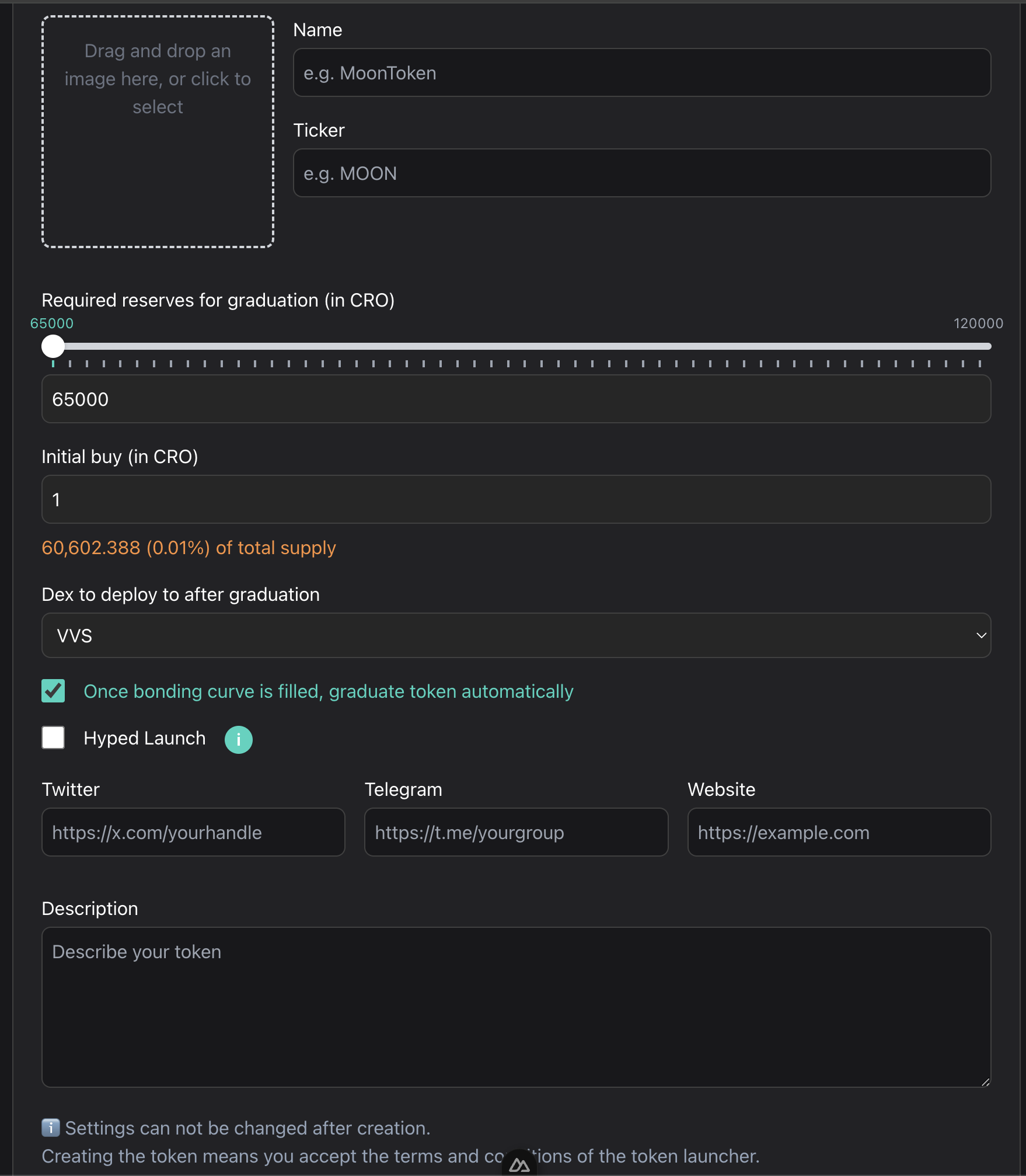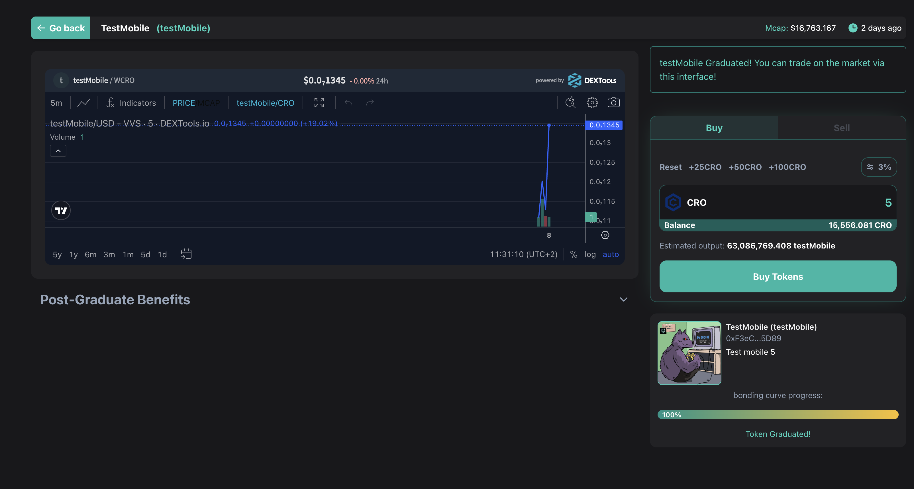 Once the predetermined CRO target is achieved, the token transitions ("graduates") from the Wolfstreet platform to the choosed DEX by the founder in the token creation process, where it becomes available for trading on the decentralized exchange. The CRO contributed during the bonding curve phase is allocated as liquidity to the token’s trading pair on the choosed DEX by the founder in the token creation process, facilitating trading activity, minus the **platform fees** and **graduation fees**.